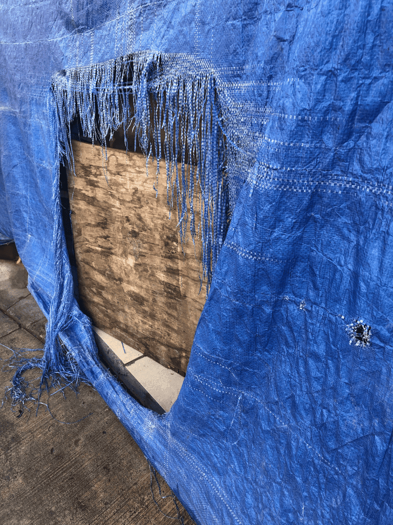 One of the issues inherent to these tarps is the fact that they are woven. Perhaps an article for another time, but tarps often come with reinforcement around the edges where users are intended to secure the tarp to the structure. In reality, these edge connections are often not sufficient, and families often feel the need to secure their tarps to their shelter mid-span, not just at the edge. Those connections are the future failure point of the tarp. Like a sweater with a snag, the tarp will begin to unravel at the puncture points. Wind, snow, and other “tensile loads” will exacerbate the problem resulting in tattering and leaks.