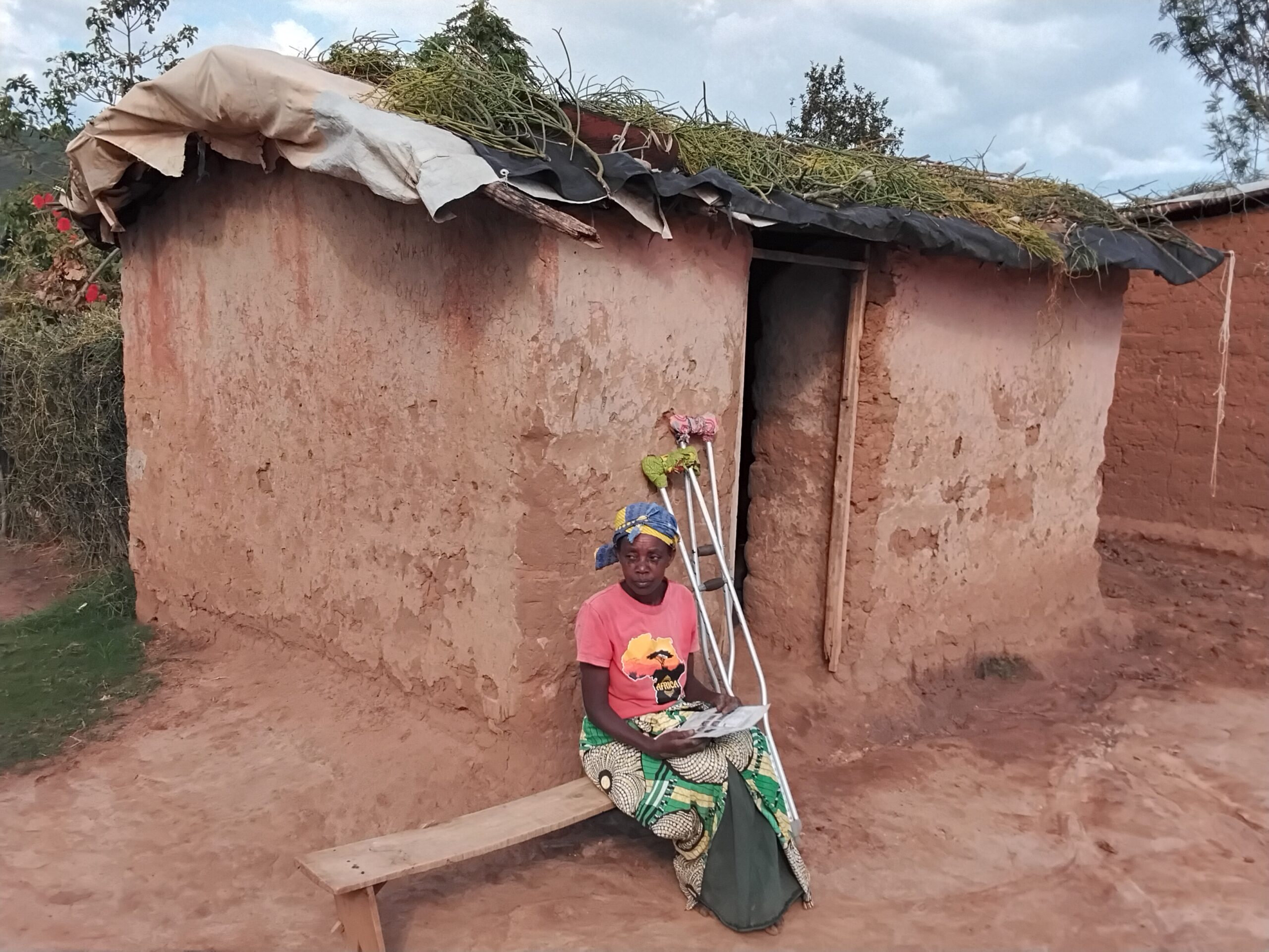 A woman named Liberata sits in front of her home, which has a leaky roof and structural issues. She lives with her two grandchildren in a mud house that was given to her because of her physical disability and inability to build a home for herself.