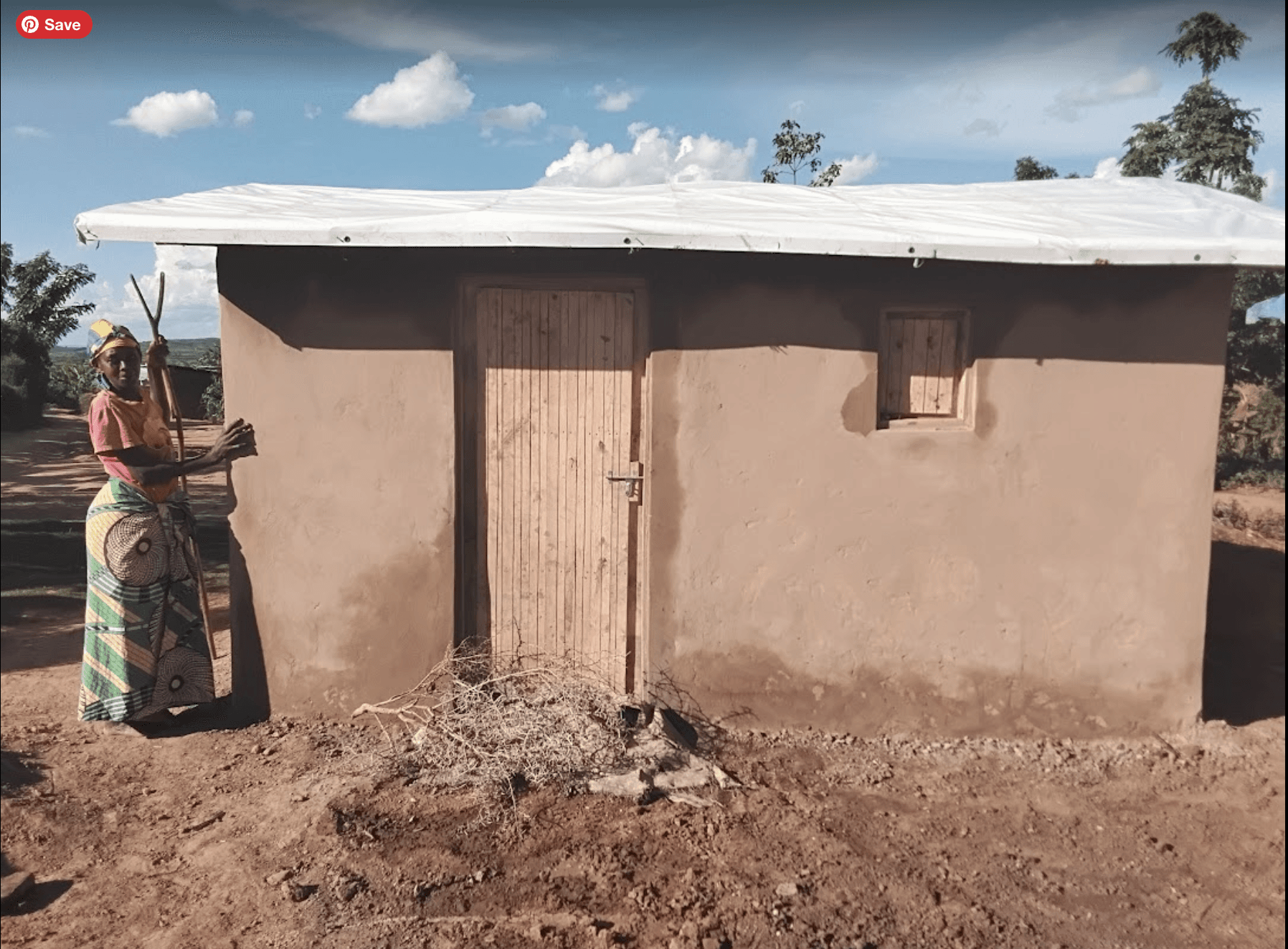 Liberata, standing in front of her repaired home with a Bashe Bora (Swahili for better tarp) roof.